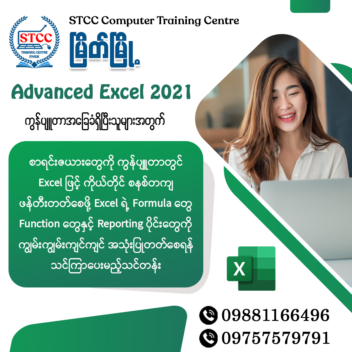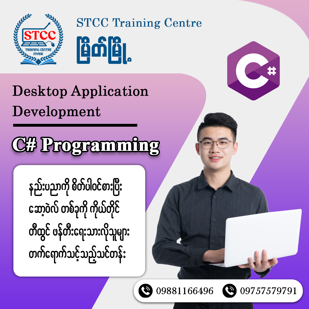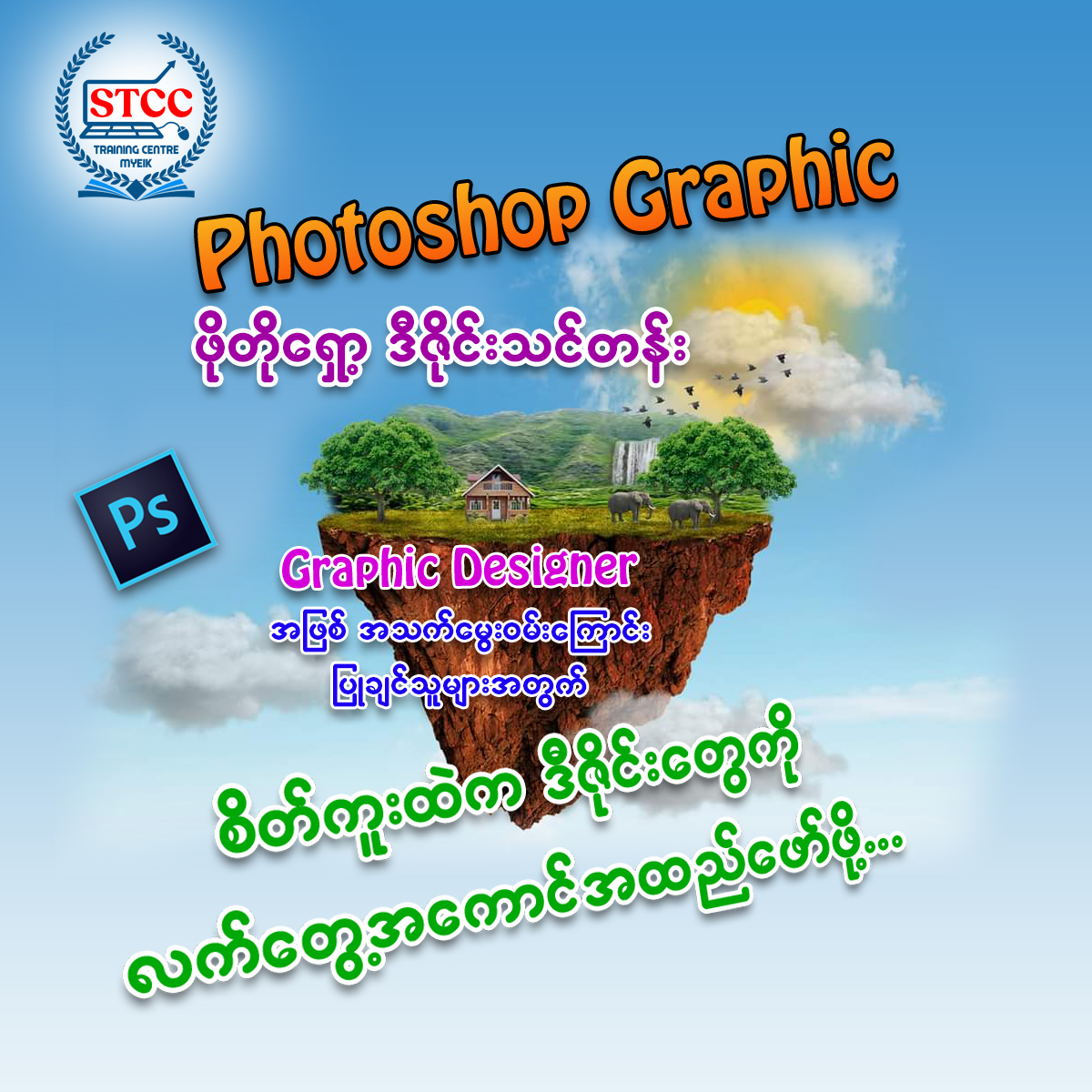 STCC ကွန်ပျူတာသင်တန်းသည် တနင်္သာရီတိုင်း/မြိတ်မြို့တွင်ဖွင့်လှစ်ထားပါသည်။ ကွန်ပျူတာအခြေခံမှစ၍ လက်တွေ့ရုံးလုပ်ငန်းသုံးသင်တန်းများ၊ Graphic Design သင်တန်းများ၊ Programming သင်တန်းများနှင့် Elementary English 4 Skills သင်တန်းများကို အိုးမကွာ အိမ်မကွာ မိမိတို့၏ မြိတ်မြို့မှာနေ၍ သင်ယူနိုင်ပါပြီ။ စိတ်ရှည်လက်ရှည်နဲ့ အတွေ့ကြုံရှိ၍ သင်ကြားမှုကောင်းမွန်သော ဆရာ/ဆရာမများမှ သင်ကြားပေးမည်ဖြစ်သောကြောင့် သင်တန်းတက်ရောက်ပြီး မတတ်မြောက်မှာကို စိုးရိမ်စရာမလိုပါဘူးနော်။ အချိန်ကိုအကျိုးရှိစွာအသုံးချနိုင်ဖို့ သင်တန်းတက်မယ်ဆိုရင် STCC မှာတက်ရောက်ဖို့ မမေ့ပါနဲ့နော်...